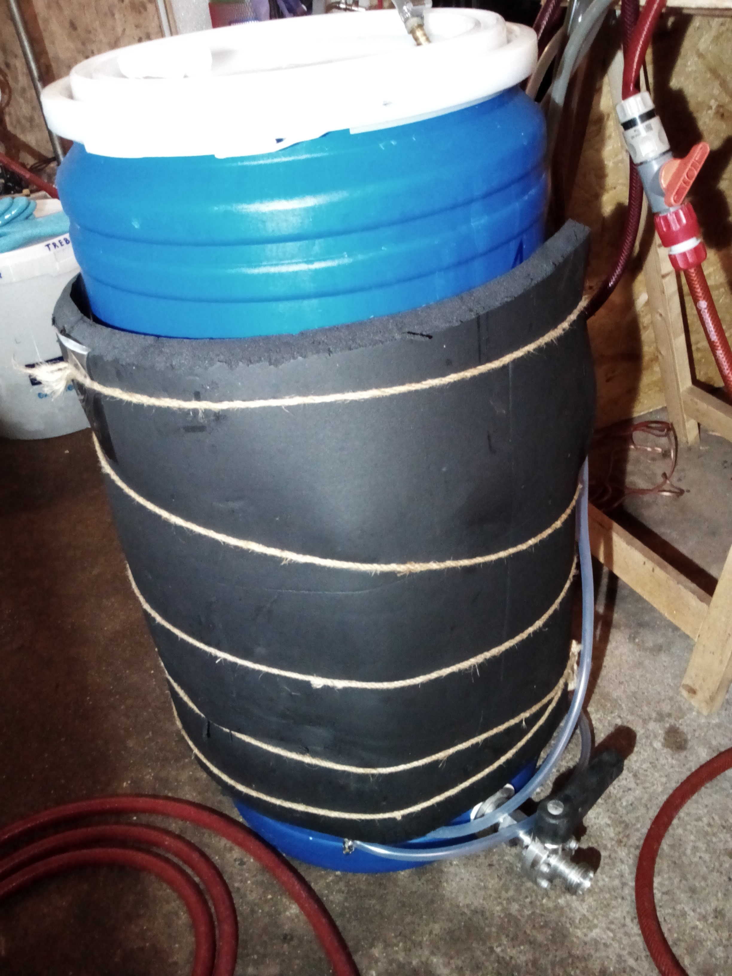 Gärfass - mit Schlauchheizwendel, isoliert. In der Garage ist es grad saukalt. Viel zu kalt für obergärig. Naja, auch für untergärig ...