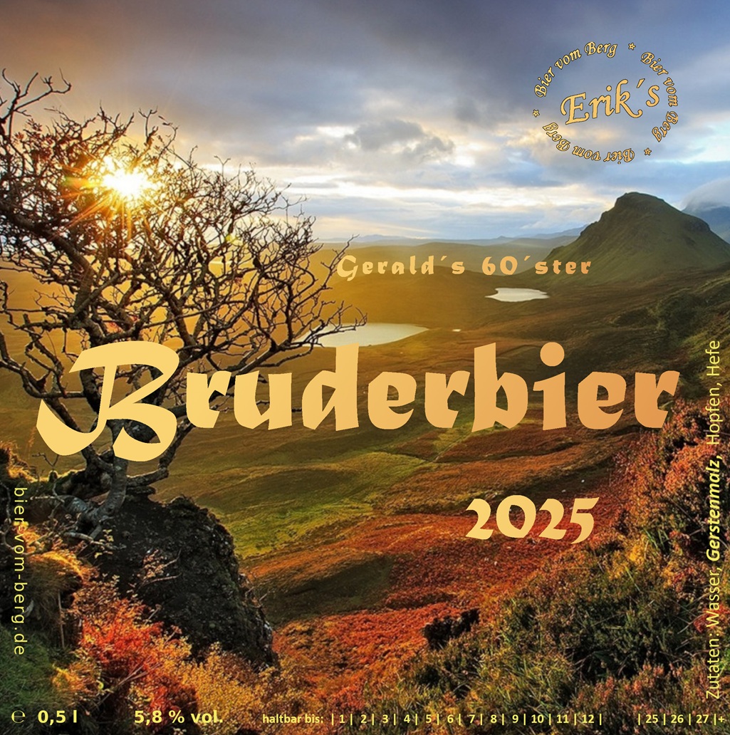 Dieses Bier habe ich für meinen besten Freund und "kleinen Bruder" Gerald zu seinem 60´sten Geburtstag gebraut. Wobei "kleiner Bruder" natürlich Quatsch ist, da wir zum Einen nicht miteinander verwandt sind (jedenfalls soweit ich weiß), außerdem ist Gerald 3 Jahre älter. Aber das ist unser kleiner Insider ;-) .